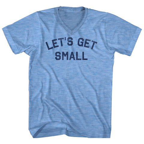 Product Story: Let's Get Small Adult Tri-Blend V-neck T-shirtProduct Description: Let's Get Small Adult Tri-Blend V-neck T-shirt Tri-Blend (Polyester, Rayon, Cotton) Buttery Smooth Soft Material Medium Weight Tee Soft Hand Print