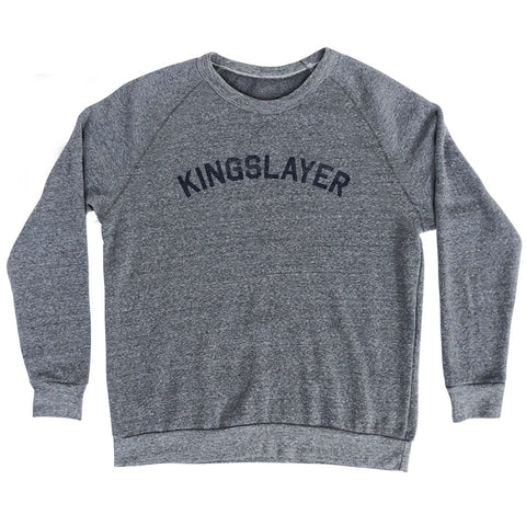 Product Story: Kingslayer Adult Tri-Blend SweatshirtProduct Description: Kingslayer Adult Tri-Blend Sweatshirt Tri-Blend (Polyester, Rayon, Cotton) Buttery Smooth Soft Material Medium Weight Tee Soft Hand Print