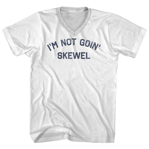 Product Story: I'm Not Goin' Skewel Adult Cotton V-neck T-shirtProduct Description: I'm Not Goin' Skewel Adult Cotton V-neck T-shirt Tri-Blend (Polyester, Rayon, Cotton) Buttery Smooth Soft Material Medium Weight Tee Soft Hand Print