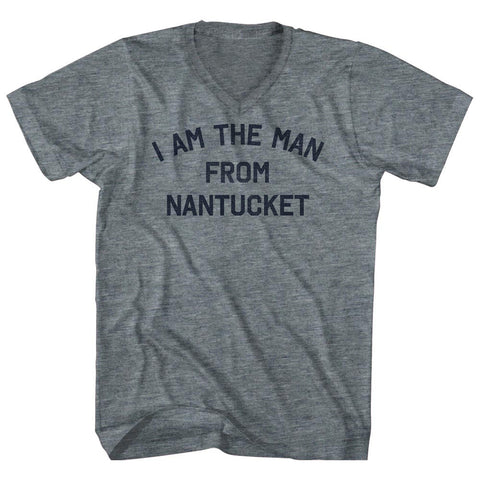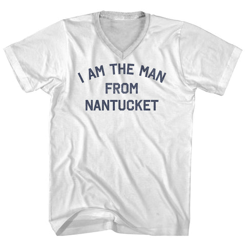 Product Story: I Am The Man From Nantucket Adult Cotton V-neck T-shirtProduct Description: I Am The Man From Nantucket Adult Cotton V-neck T-shirt Tri-Blend (Polyester, Rayon, Cotton) Buttery Smooth Soft Material Medium Weight Tee Soft Hand Print