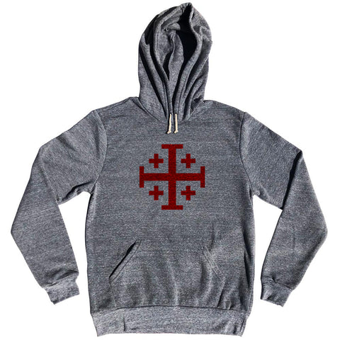 Product Story: Jerusalem Cross (Red Art) Cotton-Poly Blend HoodieProduct Description: Jerusalem Cross (Red Art) Cotton-Poly Blend Hoodie 6.5 oz. Tri-Blend Cozy Soft Material Pre-Shrunk Set-in sleeves Pouch front pocket Ribbed bottom band and sleeve cuffs