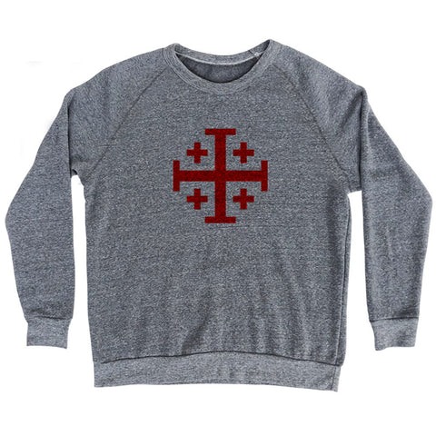 Product Story: Jerusalem Cross (Red Art) Adult Tri-Blend SweatshirtProduct Description: Jerusalem Cross (Red Art) Adult Tri-Blend Sweatshirt Tri-Blend (Polyester, Rayon, Cotton) Buttery Smooth Soft Material Medium Weight Tee Soft Hand Print