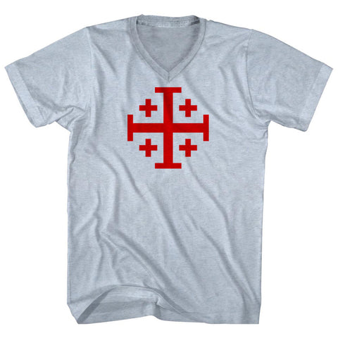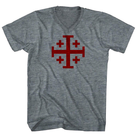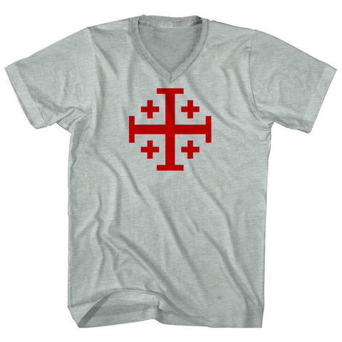 Product Story: Jerusalem Cross (Red Art) Adult Tri-Blend V-neck T-shirtProduct Description: Jerusalem Cross (Red Art) Adult Tri-Blend V-neck T-shirt Tri-Blend (Polyester, Rayon, Cotton) Buttery Smooth Soft Material Medium Weight Tee Soft Hand Print