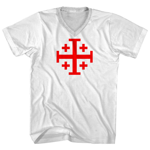 Product Story: Jerusalem Cross (Red Art) Adult Cotton V-neck T-shirtProduct Description: Jerusalem Cross (Red Art) Adult Cotton V-neck T-shirt Tri-Blend (Polyester, Rayon, Cotton) Buttery Smooth Soft Material Medium Weight Tee Soft Hand Print