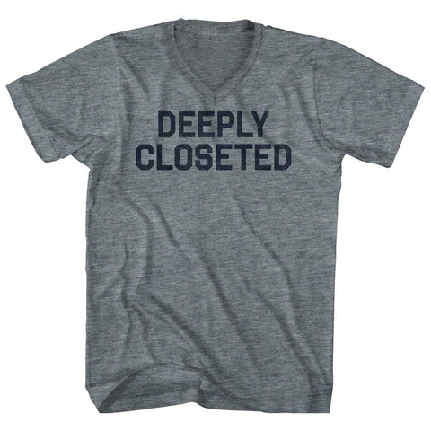 Product Story: Deeply Closeted Adult Cotton V-neck T-shirtProduct Description: Deeply Closeted Adult Cotton V-neck T-shirt Tri-Blend (Polyester, Rayon, Cotton) Buttery Smooth Soft Material Medium Weight Tee Soft Hand Print