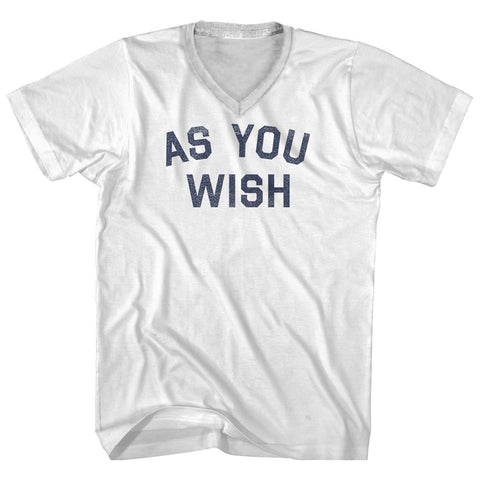 Product Story: As You Wish Adult Cotton V-neck T-shirtProduct Description: As You Wish Adult Cotton V-neck T-shirt Tri-Blend (Polyester, Rayon, Cotton) Buttery Smooth Soft Material Medium Weight Tee Soft Hand Print