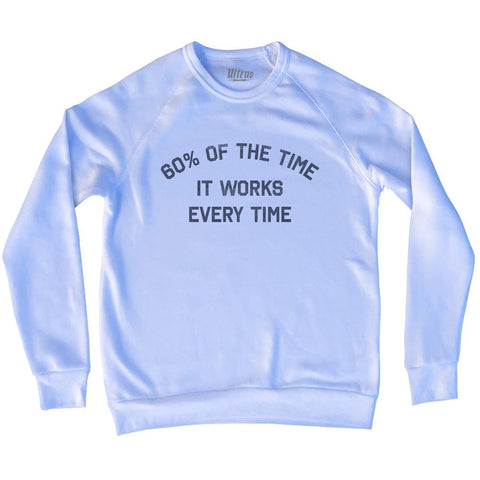 Product Story: 60% Of The Time It Works Every Time Adult Tri-Blend SweatshirtProduct Description: 60% Of The Time It Works Every Time Adult Tri-Blend Sweatshirt Tri-Blend (Polyester, Rayon, Cotton) Buttery Smooth Soft Material Medium Weight Tee Soft Hand Print