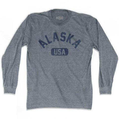 Product Story: Alaska USA Adult Tri-Blend Long Sleeve T-shirtProduct Description: Tri-Blend (Polyester, Rayon, Cotton) Buttery Smooth Soft Material Premium T-shirt Medium Weight Tee Soft Hand Print