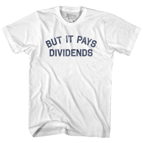 Product Story: But It Pays Dividends Womens Cotton Junior Cut T-ShirtProduct Description: But It Pays Dividends Womens Cotton Junior Cut T-Shirt Cotton (90% Cotton &10% Polyester) Buttery Smooth Soft Material Medium Weight Tee Soft Hand Print