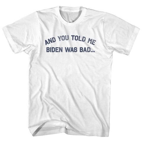 Product Story: And You Told Me Biden Was Bad... Trump Womens Cotton Junior Cut T-ShirtProduct Description: And You Told Me Biden Was Bad... Trump Womens Cotton Junior Cut T-Shirt Cotton Buttery Smooth Soft Material Medium Weight Tee Soft Hand Print