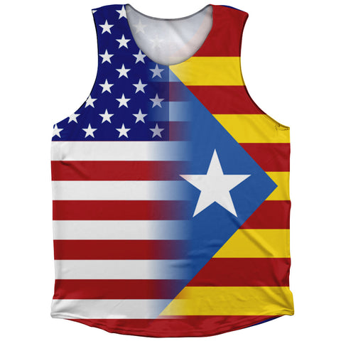 Product Story: American Flag And Catalonia Flag Combination Running Racerback Singlet Track Tank TopProduct Description: American Flag And Catalonia Flag Combination Running Racerback Singlet Track Tank Top Lightweight Polyester Sublimation Forever Color Lasting Perfect Fit Made in USA