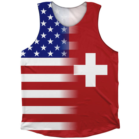 Product Story: American Flag And Switzerland Flag Combination Running Racerback Singlet Track Tank TopProduct Description: American Flag And Switzerland Flag Combination Running Racerback Singlet Track Tank Top Lightweight Polyester Sublimation Forever Color Lasting Perfect Fit Made in USA