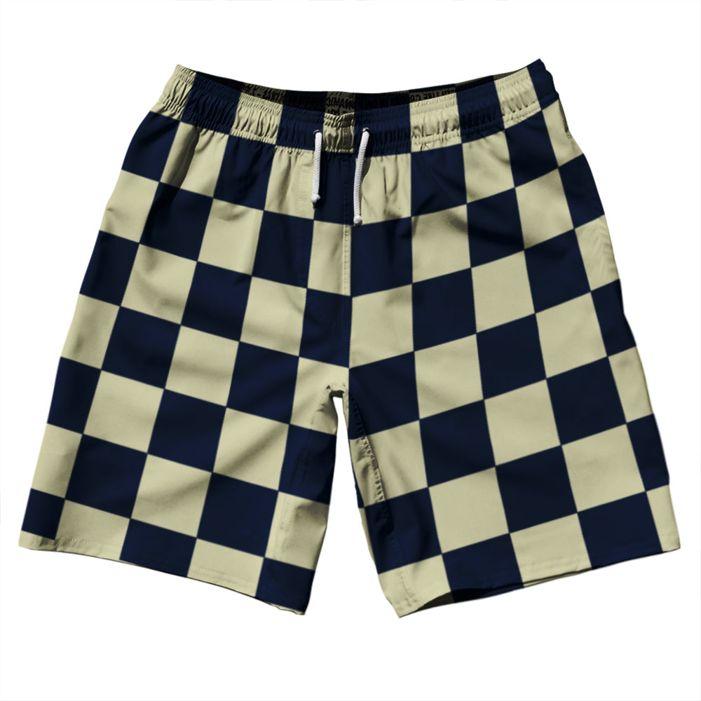 - Checkerboard 2.5 Inches Blue Navy and Vegas Gold 10" Swim Shorts Made in USA