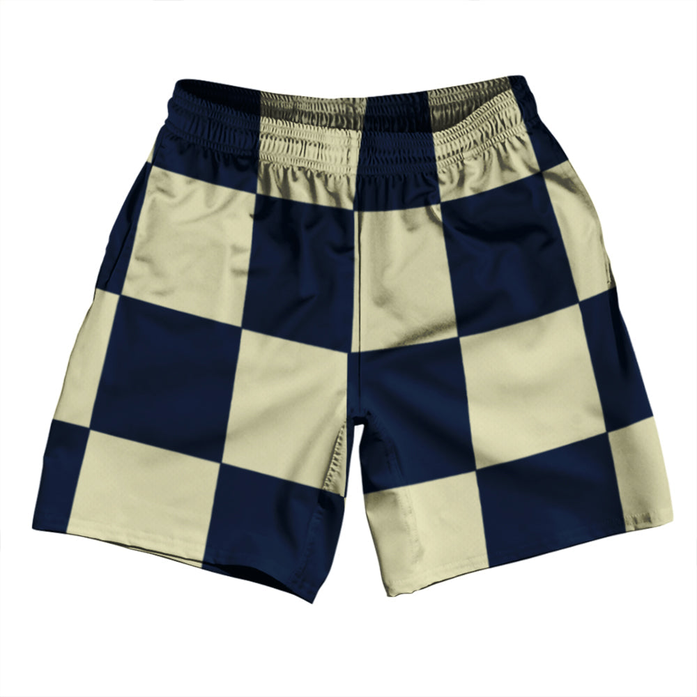 Checkerboard 5 Inches Blue Navy and Vegas Gold Soccer Shorts Made In USA