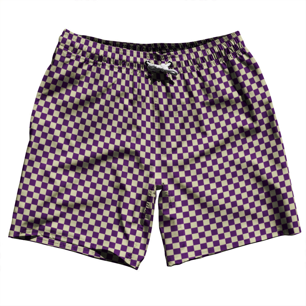 - Checkerboard Half Inch Purple Medium and Vegas Gold Swim Shorts 7" Made in USA