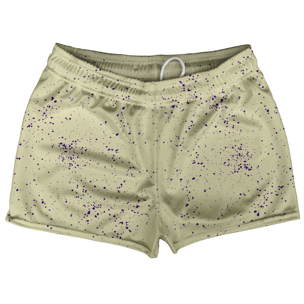 - Super Fly Pattern Purple Medium and Vegas Gold Shorty Short Gym Shorts 2.5" Inseam Made In USA